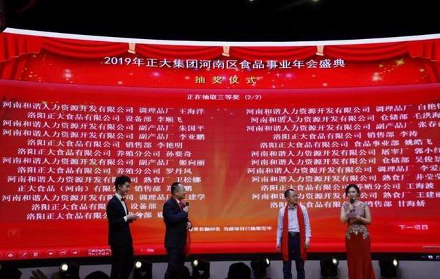 2019年1月21日,“龍頭騰起攬全月,鴻鵠展翅傲中原”——正大集團河南區食品事業(yè)2019新春年會(huì )洛陽(yáng)東華大酒樓盛大召開(kāi)。正大集團農牧食品企業(yè)(中國)副董事長(cháng)王鴻章、正大集團河南區食品事業(yè)***總裁王學(xué)斌、正大集團河南區產(chǎn)業(yè)化總裁宋小兵及河南區食品事業(yè)各公司部門(mén)主管、員工代表300余人齊聚一堂,共享盛典。年會(huì )特邀河南東方正大有限公司洛陽(yáng)飼料廠(chǎng)董事長(cháng)茹懷智、中方副總經(jīng)理黃天發(fā)及河南和諧人力資源開(kāi)發(fā)有限公司董事、總經(jīng)理王縣委、副總經(jīng)理張麗云參加。