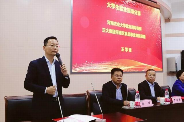 王學(xué)斌***總裁講述了自己的奮斗歷程,并結合自身經(jīng)歷和正大集團事業(yè)規劃,為在場(chǎng)畢業(yè)生做就業(yè)指導報告。為大家的就業(yè)選擇提供指導,提醒同學(xué)們選擇自己適合的工作。